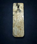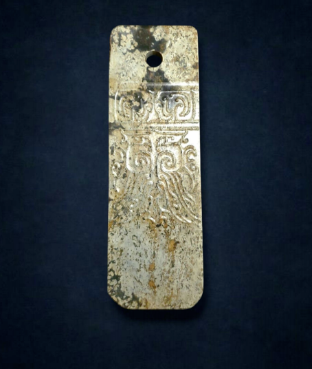 河磨白玉,莹潤流亮,通體水意沁,蓝綠鬱黒,器表覆蓋大部份灰皮及少許淺褐沁氣象古穆著茫,器型規整渾厚,一面飾以剔地陽紋神人默面紋,神人戴冠,旋目,默面纹在神人上方,具雙目圆眼,纹飾流8精緻華,一派莊重典雅,威嚴神秘。器另-面則素纹,玉圭為祭祀禮器,敬四方山川自然,亦寓冇天授政權之意涵。今年2025嘉德春拍,亦有一件石家河之玉圭上拍,预估價達2百80萬元以上,可見石家河文化玉圭之珍罕難得 。